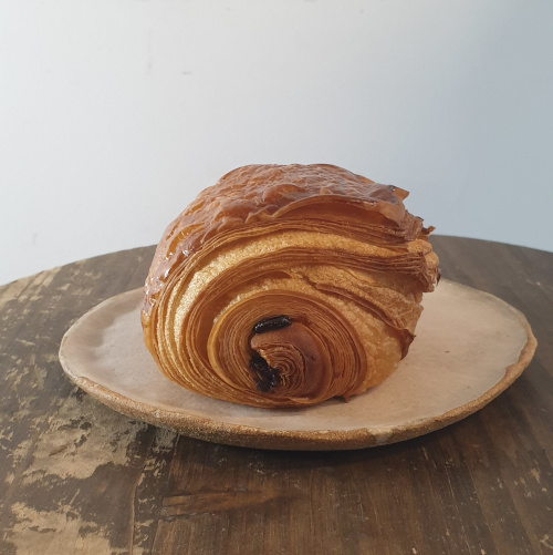 Comme un croissant mais en mieux. Il est lui aussi fabriqué à partir de farine Label Rouge CRC du moulin du Courneau, avec du beurre AOP de Charentes Poitou et plein d’autres bonnes choses, mais en plus on y met deux bâtons de chocolat Cluizel 60% de cacao.